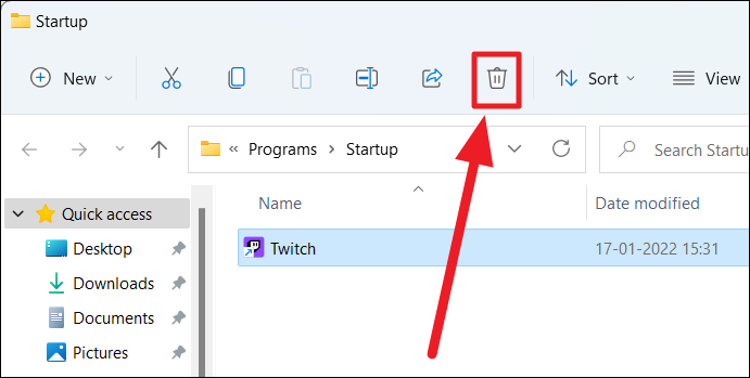 You will redirect to the startup folder instantly. Here, navigate ‘Twitch’ and click on it to highlight the ribbon icons. Click on the trashcan icon; the ‘Delete’ button in the ribbon. You can also double-finger tap on ‘Twitch’ and click the same icon on the menu’s ribbon.