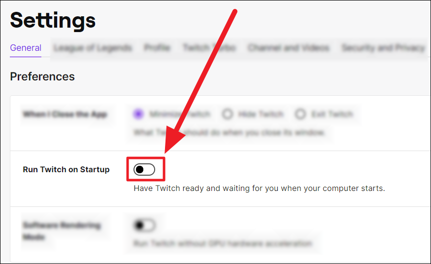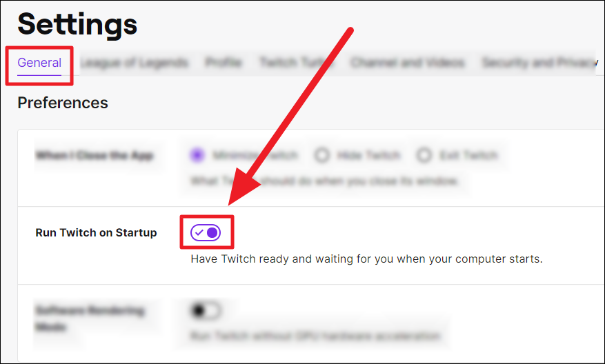 The first ‘Settings’ tab you land on is the ‘General’ tab. Stay on this tab and navigate the ‘Run Twitch on Startup’ option under ‘Preferences’. Click the toggle next to this option to turn the purple toggle button to black and white. Thus disabling the setting.