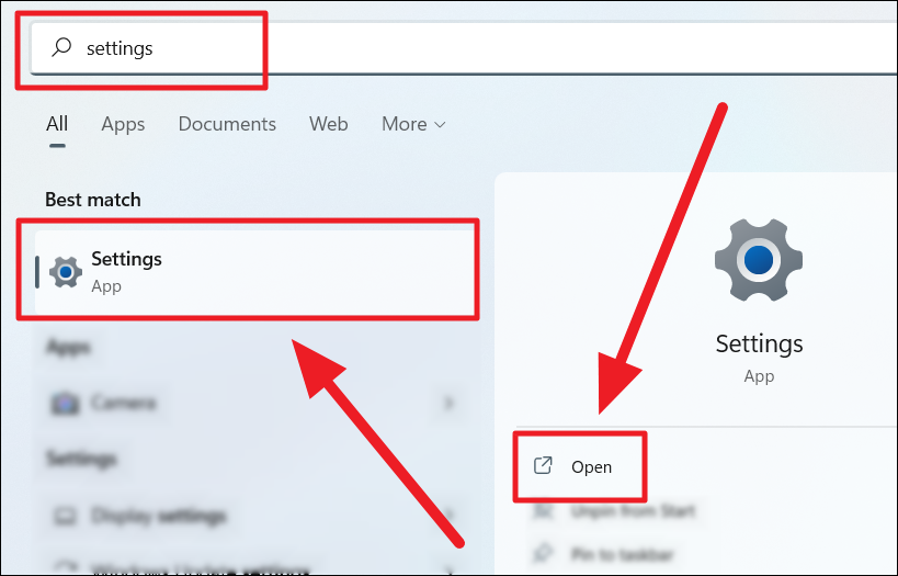 Type ‘Settings’ in the search field at the top of the ‘Search’ box. Select the appropriate search result on the left. Or click the ‘Open’ button in the app options on the right.