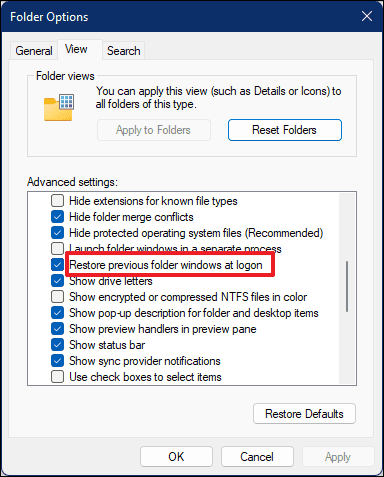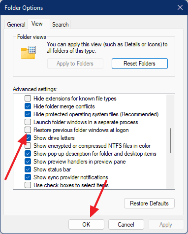 Advanced settingslist and uncheck the optionRestore previous folder windows at logon. - Click