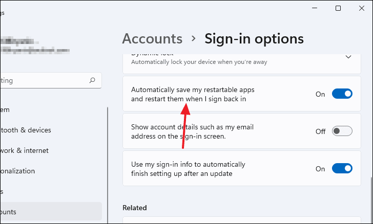 Additional settingssection, locate the optionAutomatically save my restartable apps and restart them when I sign back in.