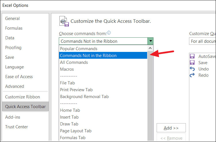 Step 2: In the Excel Options dialog box that appears, choose 'Commands Not in the Ribbon' from the 'Choose commands from' drop-down list.
