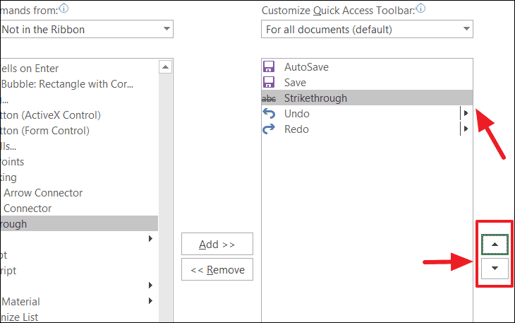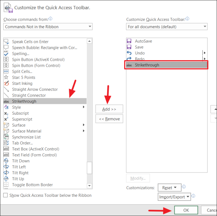Step 3: Scroll through the list of commands and select 'Strikethrough'. Click the 'Add' button to add it to the Quick Access Toolbar.