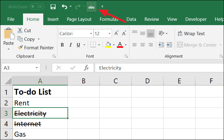 The strikethrough button will now appear in the Quick Access Toolbar at the top of your Excel window.