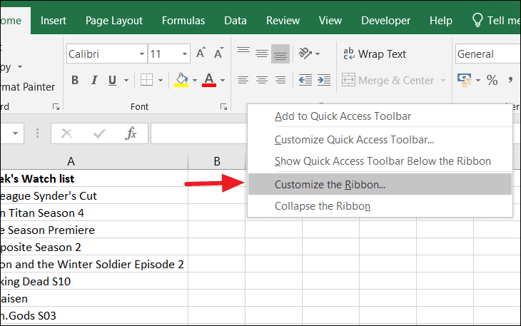 Step 1: Right-click anywhere on the ribbon and select 'Customize the Ribbon...' from the context menu.