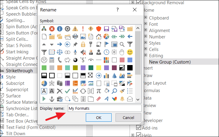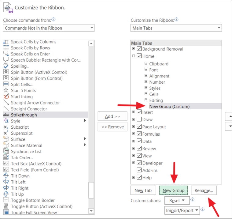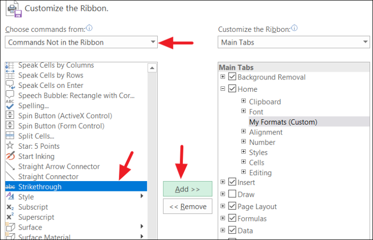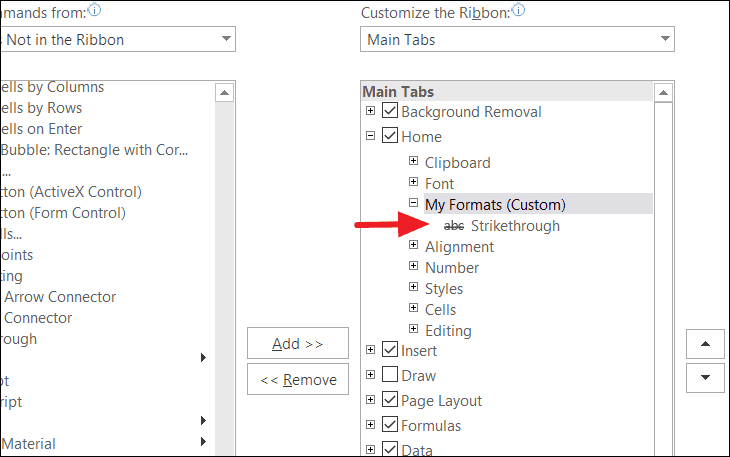 Step 5: Click the 'Add' button to include the strikethrough command in your custom group. Use the up and down arrow buttons to position the group where you want it on the ribbon. Click 'OK' to save the changes.