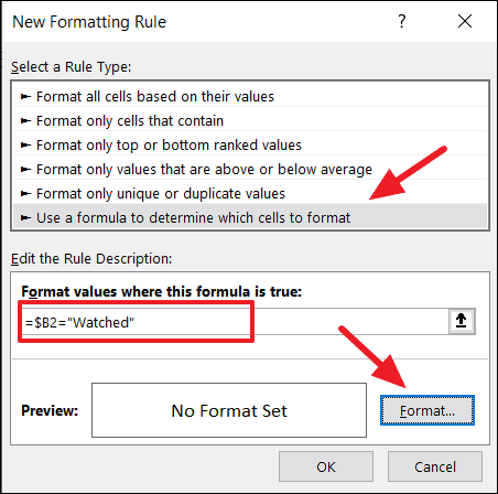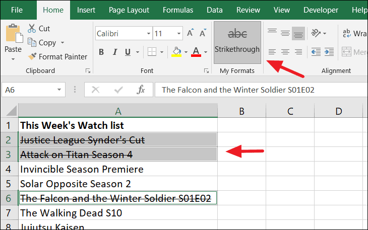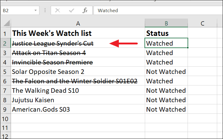 Now, when you update the status to 'Watched' in column B, the corresponding cell in column A will automatically display the strikethrough formatting.