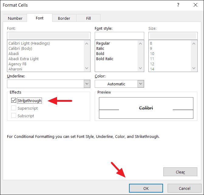 Step 4: Click 'Format...' to open the Format Cells dialog. Navigate to the 'Font' tab and check the 'Strikethrough' option under the 'Effects' section. Click 'OK' to close both dialog boxes and apply the rule.