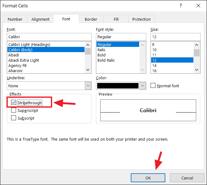 Step 3: In the Format Cells dialog, navigate to the 'Font' tab. Under the 'Effects' section, check the box next to 'Strikethrough'. Click 'OK' to apply the formatting.