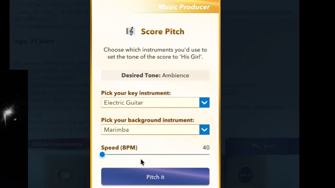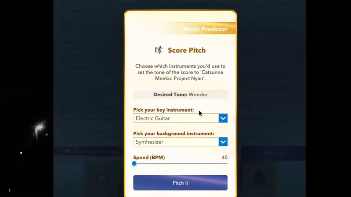 After accepting a project, you submit a concept by selecting instruments and setting the tempo. The combination must match the requested mood. For a Sorrow Theme, effective choices include cello or acoustic guitar as the main instrument, with double bass or French horn in the background, and a BPM between 50 and 70.