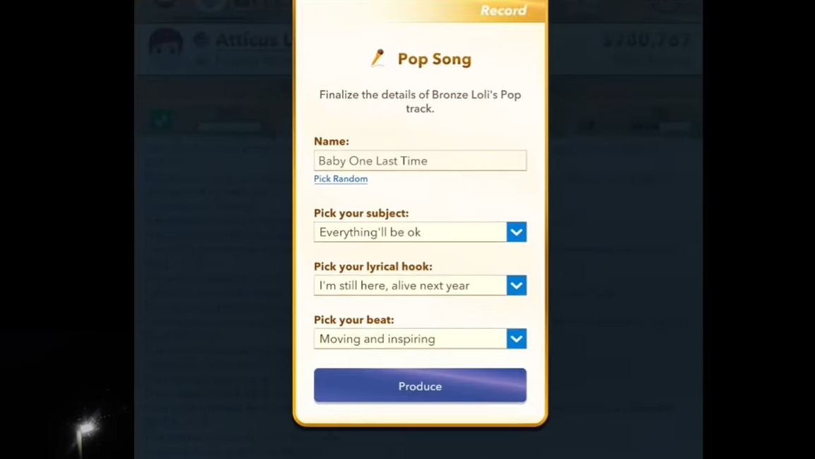 Your primary job involves creating beats for artists signed to your label. Press the Produce Track button and select an artist from your company's roster. The critical step is building a sample that aligns with the singer's strengths and established vibe.