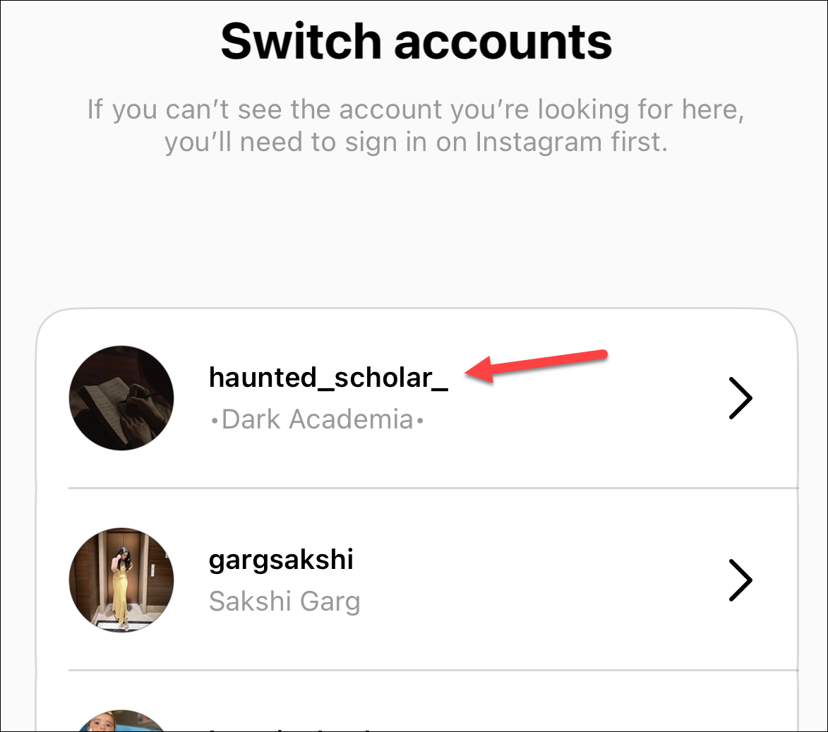 You'll see all your Instagram accounts that are logged into the Instagram app listed there. Tap on the one you want to log into.