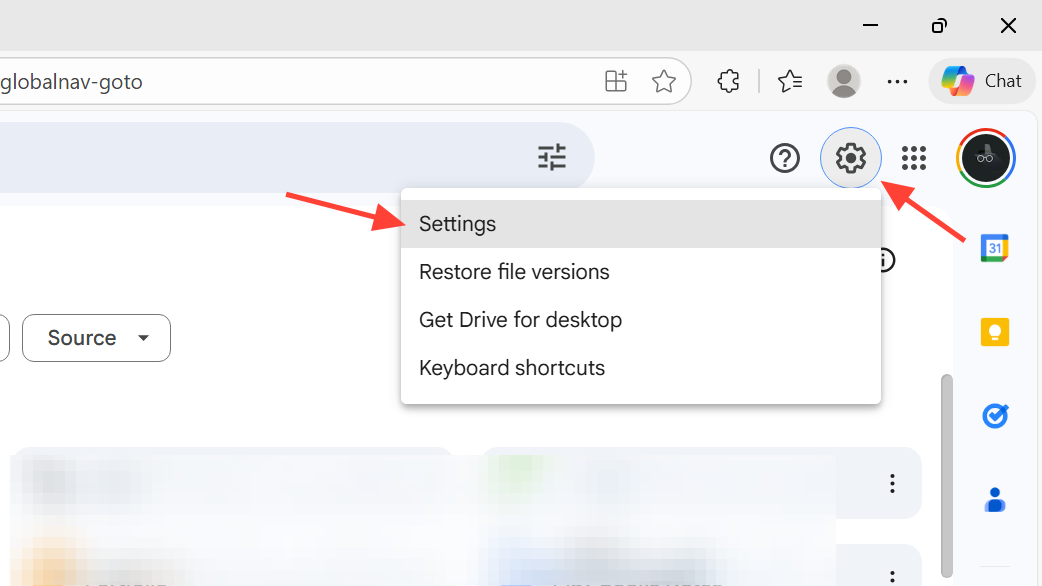 Step 2: Click the settings gear icon in the upper-right corner of the Google Drive page. This gear icon opens configuration options for how Drive behaves for your account, including integrations with other Google services.