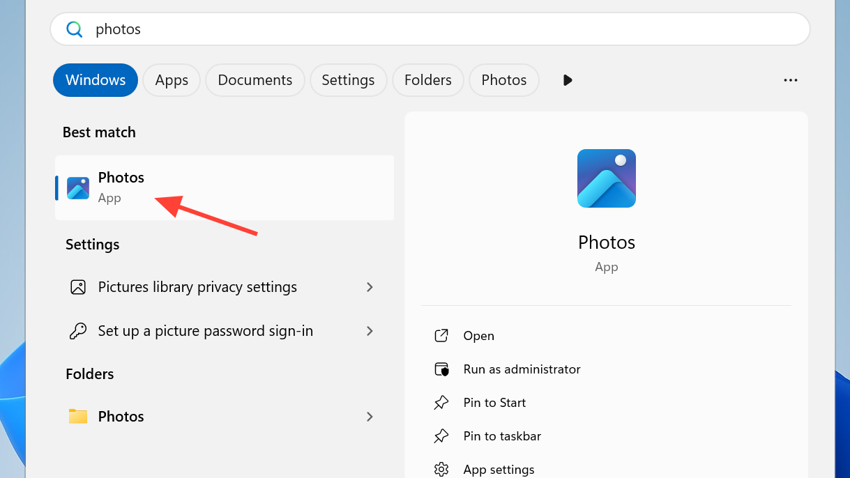 Step 1: Open the Photos app on your Windows 11 PC by selecting the Start button, typing Photos, and choosing the Photos app from the results. This launches the image viewer and manager that ships with Windows 11.