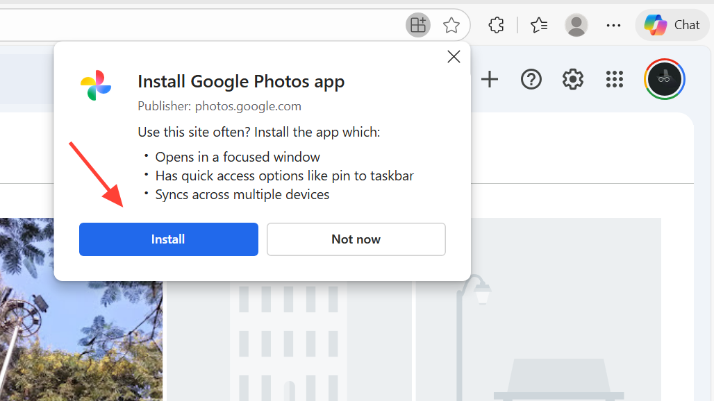 Step 3: Click the install icon and confirm that you want to install Google Photos as an app. The browser creates a standalone window for Google Photos and adds a shortcut to your desktop or Start menu for quick access.