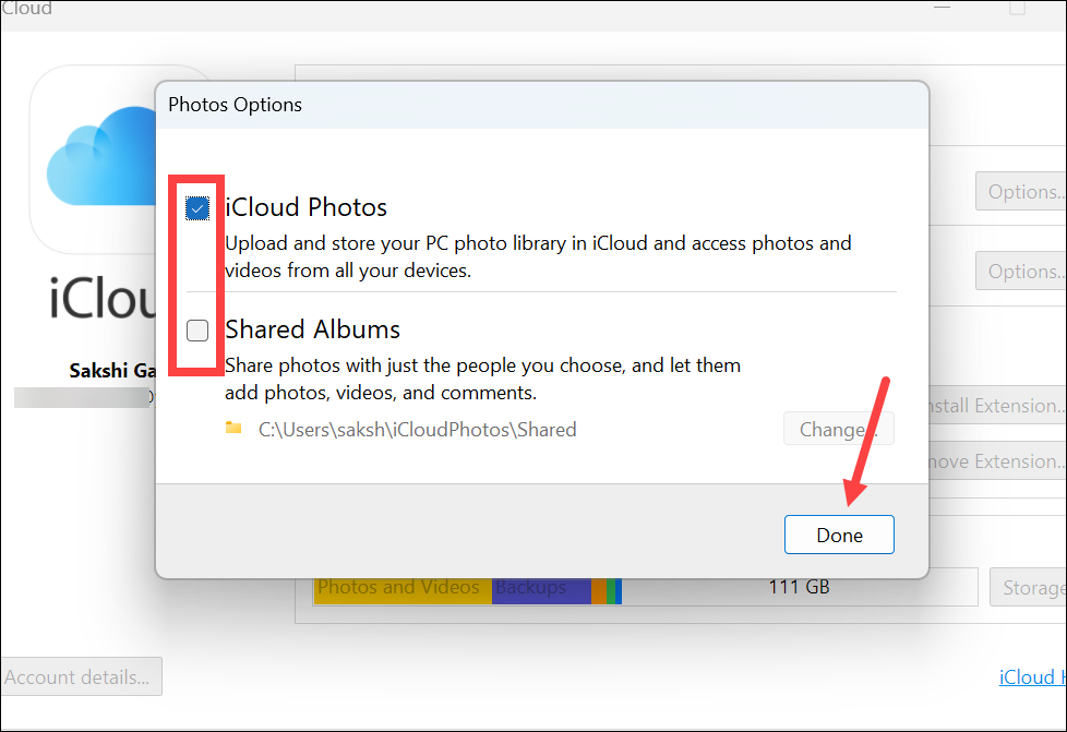Optionsbutton next toPhotosto customize your sync settings. - Select the albums you want to synchronize by checking