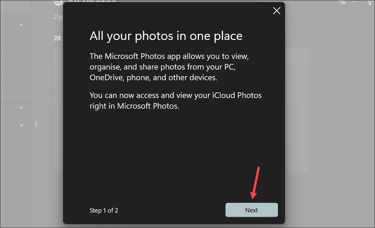 Photosapp on your Windows 11 computer. - If you have the latest update, an onboarding message highlighting the new iCloud Photos integration will appear. Click