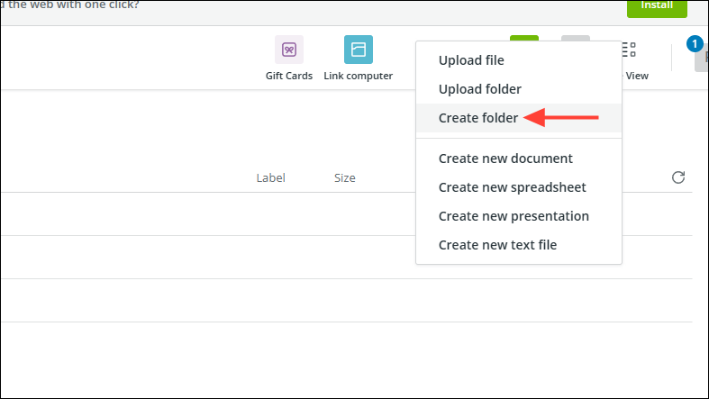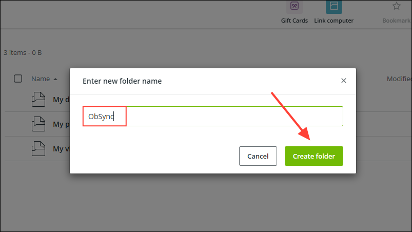 - Give the folder a name you can easily remember, like ObSync and click on the 'Create folder' button.