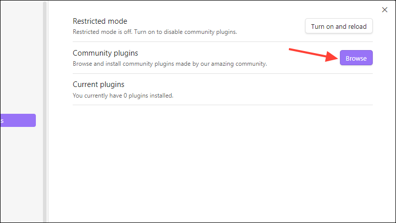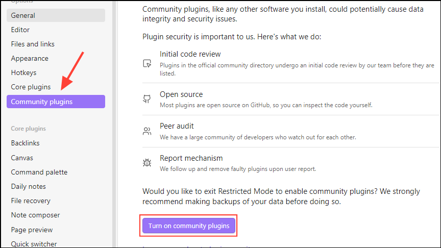 - Click on 'Community plugins' on the left before clicking on the 'Turn on community plugins' button. You can skip this step if you've already enabled it.