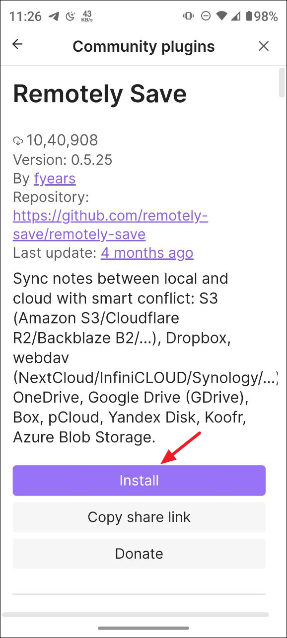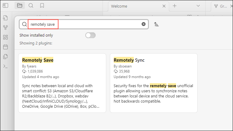 - Search for the 'Remotely Save' plugin and tap on the 'Install' button after you find it.