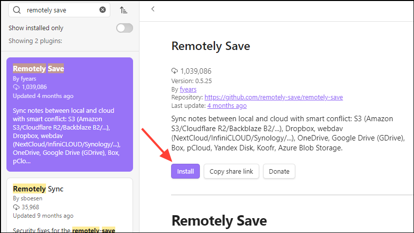 - Select the Remotely Save plugin when it appears in the search results and then click on the 'Install' button.
