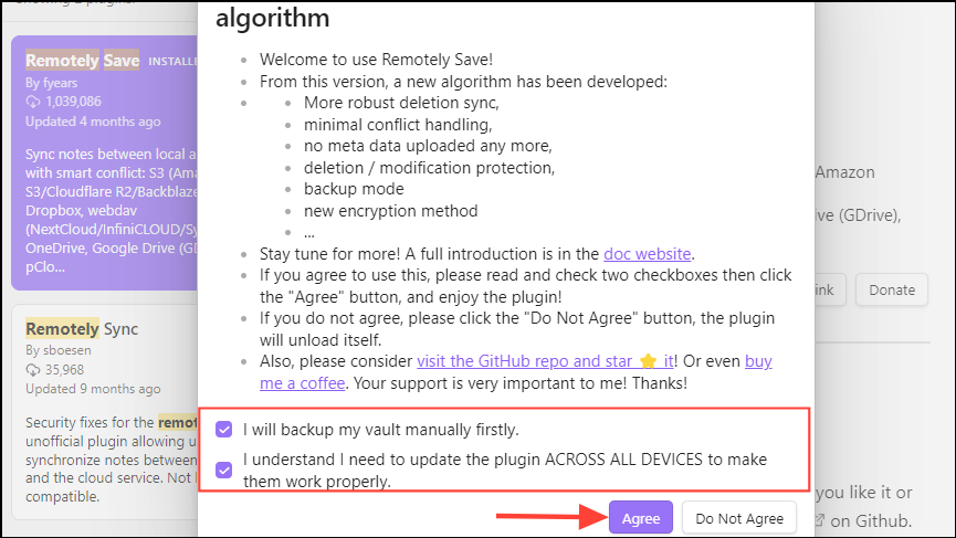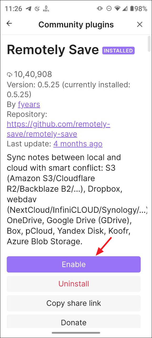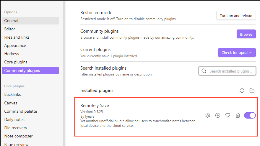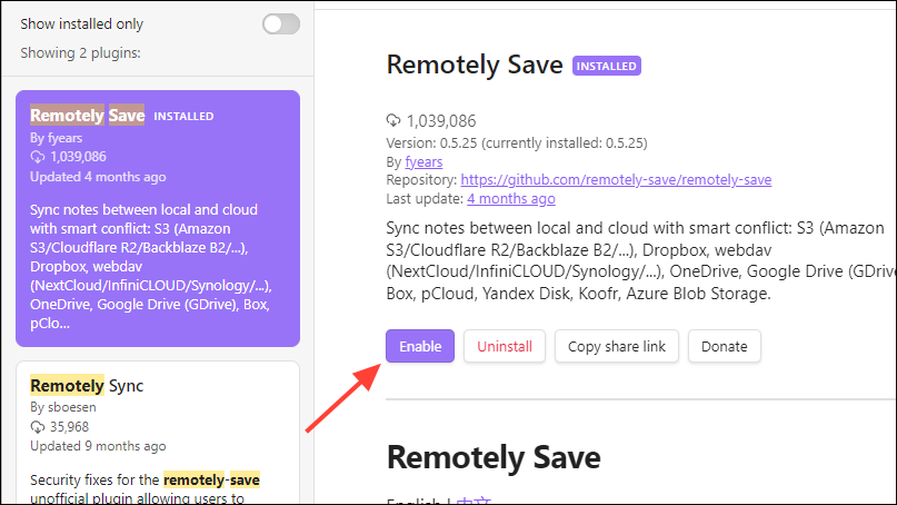 - Close the pop-up and you should now see the Remotely Save plugin appear in the 'Installed plugins' section.