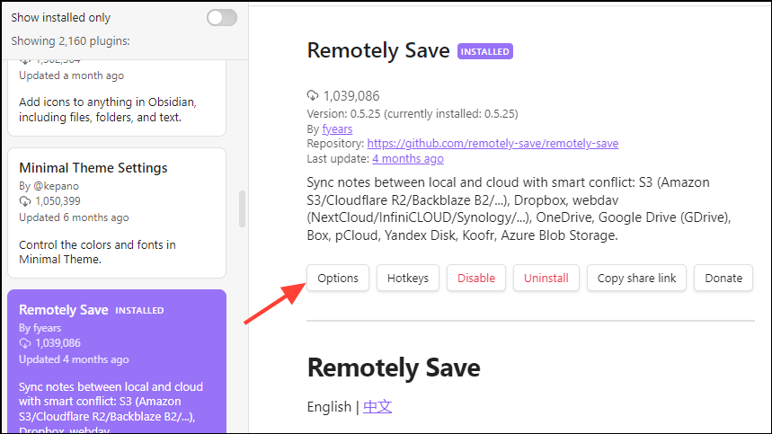 - Click on the Remotely Save plugin and then click on the 'Options' button.