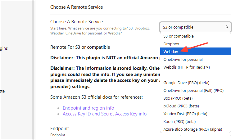 - Now, click on the dropdown menu on the right of 'Choose A Remote Service' and select 'Webdav'.