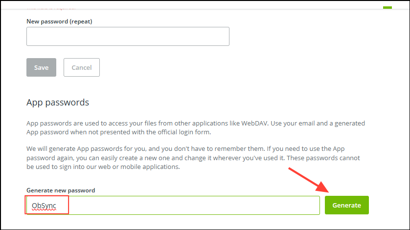 - Scroll down to the 'App passwords' section and type the folder name in the 'Generate new password' field before clicking on the 'Generate' button.