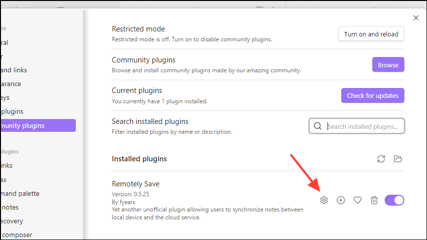 - Again, go to 'Community plugins' on the left and click on the gear icon in Remotely Save plugin section on the right.