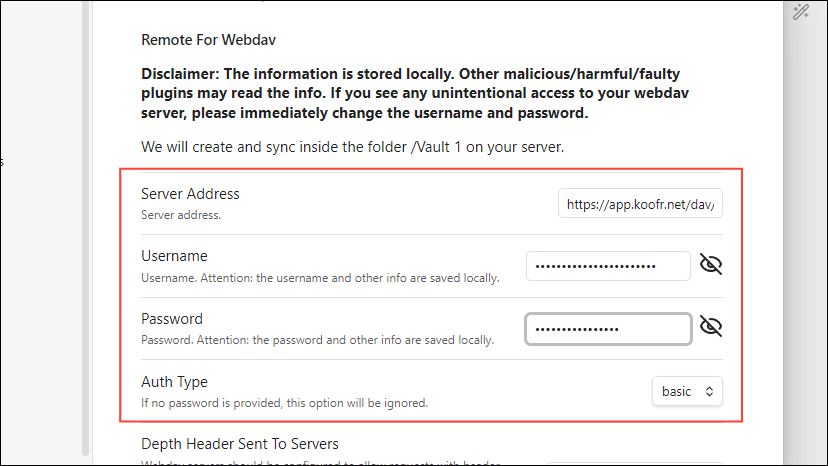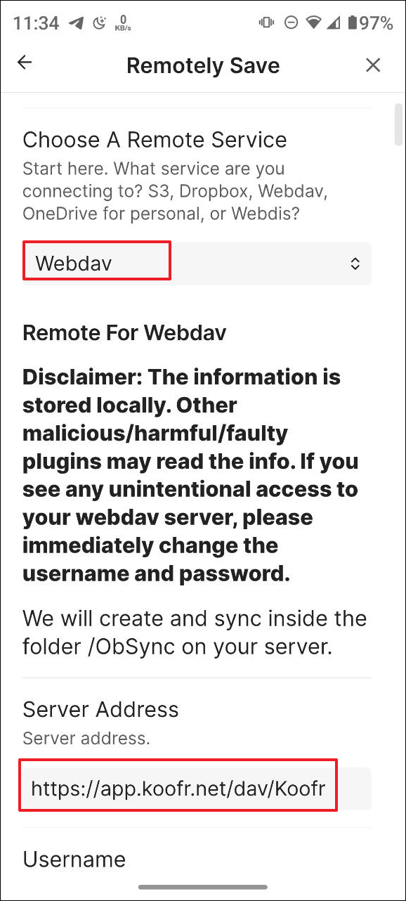 https://app.koofr.net/dav/Koofrin the 'Server Address' field, the email address you used to sign up on the Koofr website in the 'Username' field, and the password you generated on Koofr in the 'Password' field.