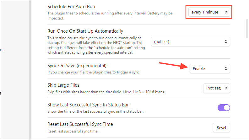 - If you want, you can also change other settings. For instance, you can change 'Schedule For Auto Run' to every one minute. Also, enable the 'Sync on Save' option and set the 'Abort Sync If Modification Above Percentage' to 100.