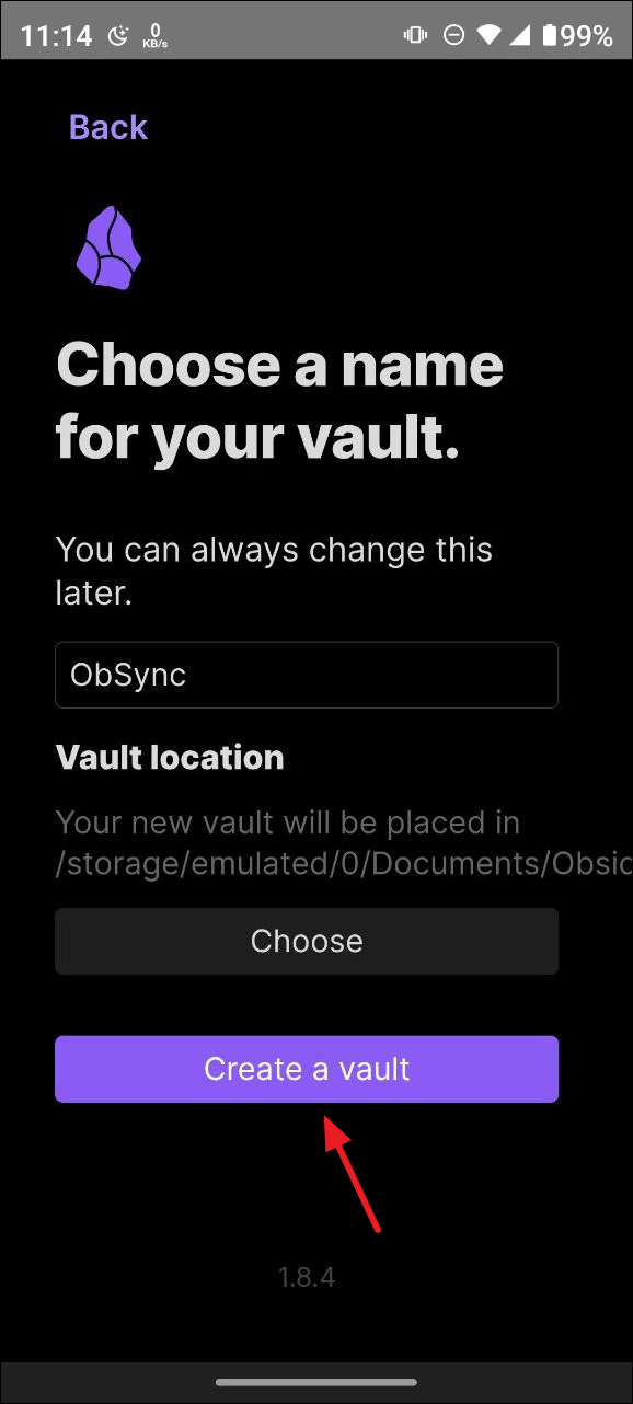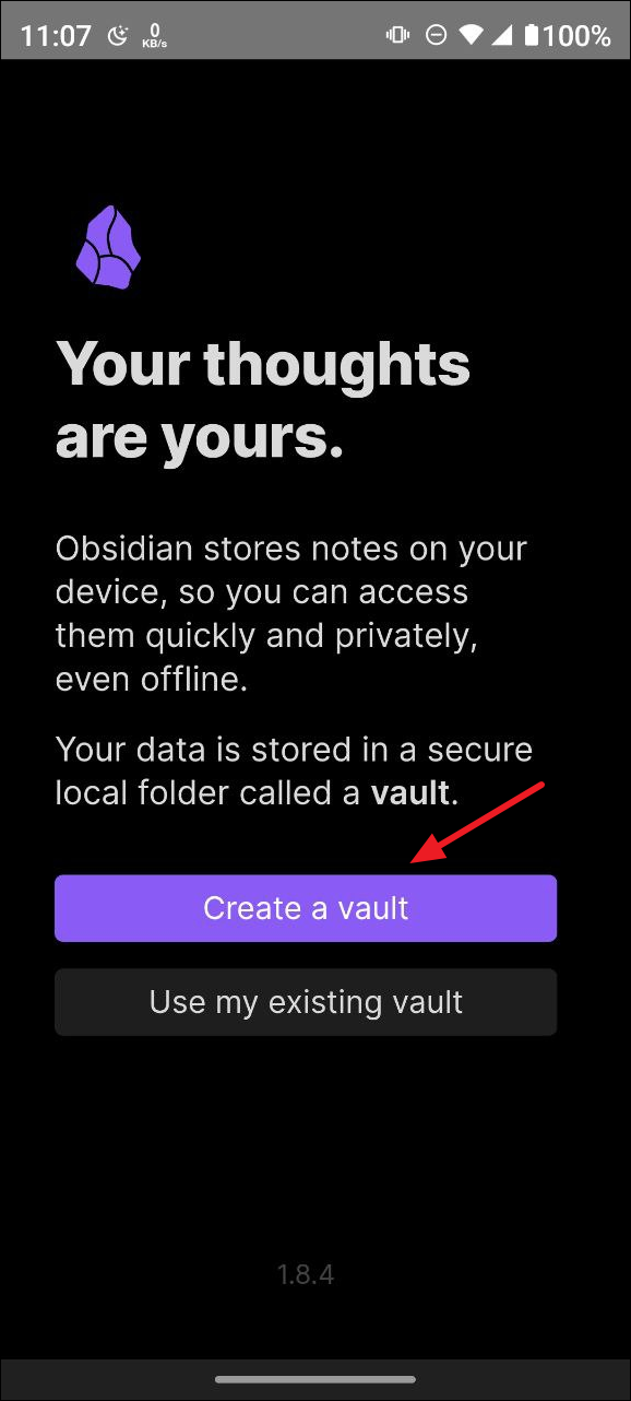 - Download the Obsidian app from the Play Store or App Store and tap on 'Create a vault'.