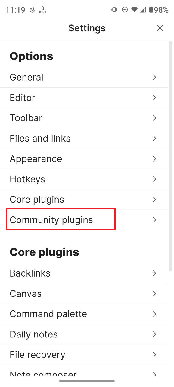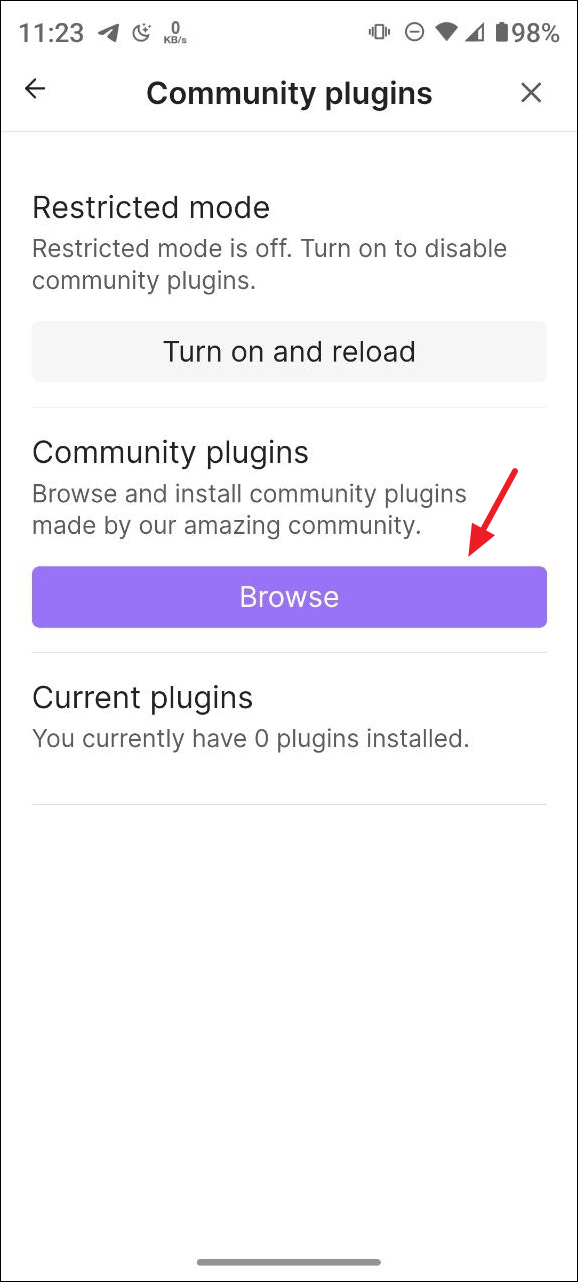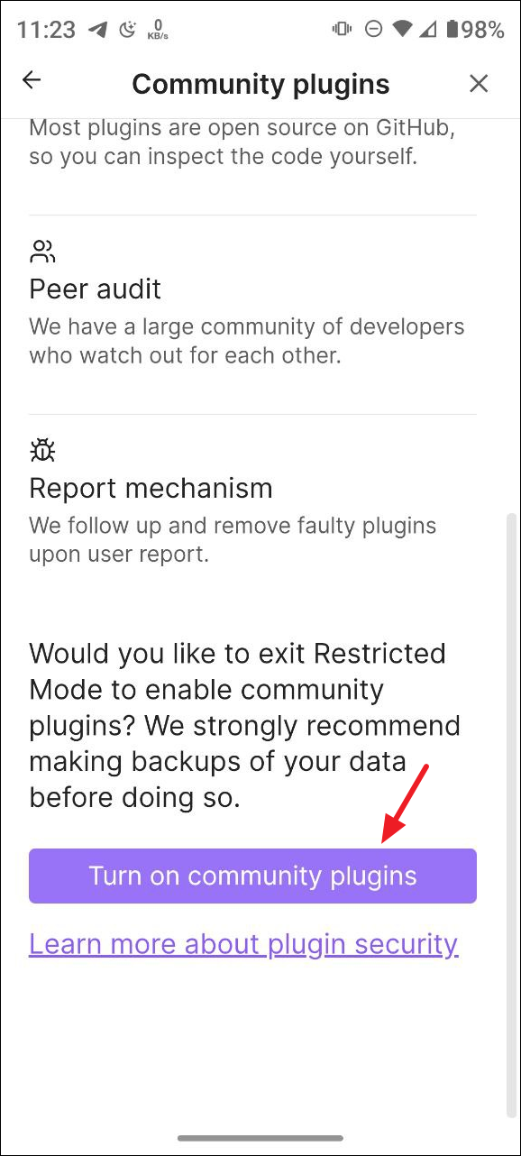 - Scroll down and tap on the 'Turn on community plugins' button.