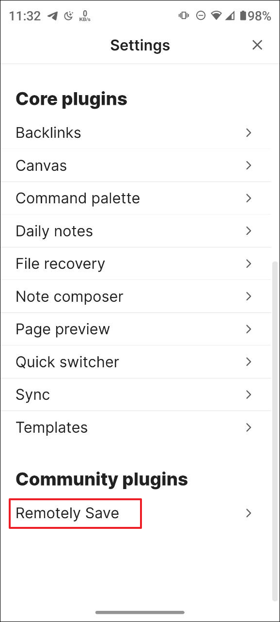 - Now, return to the Settings page and scroll to the bottom. Tap on 'Remotely Save' under Community plugins.