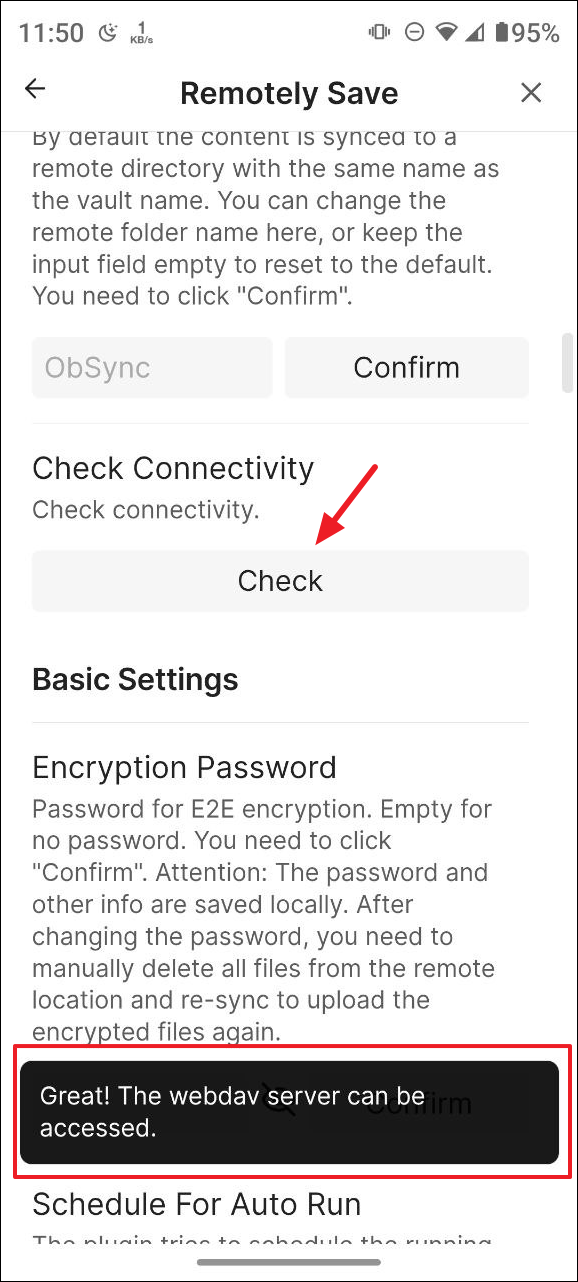 - Tap the 'Check' button under 'Check connectivity' to see whether the server is working. If it is, you will see a notification that the server can be accessed. Your Obsidian notes should now automatically sync between the two devices.