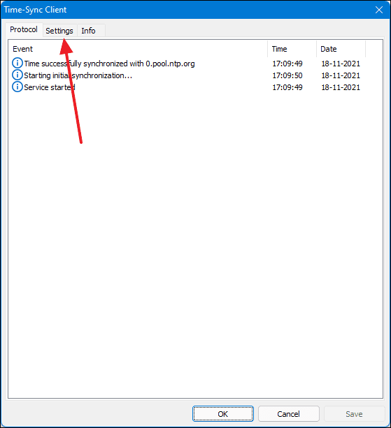 - In the Time-Sync Client window, navigate to the Settings tab.