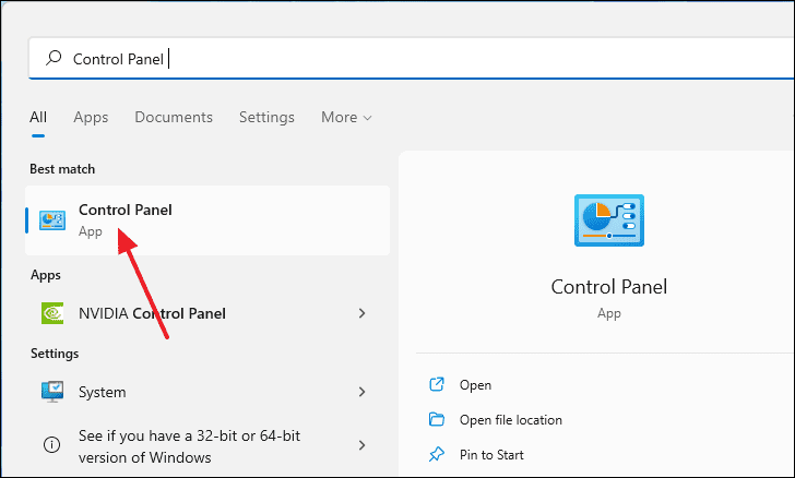 Startbutton and typeControl Panelin the search bar. Select it from the search results.
