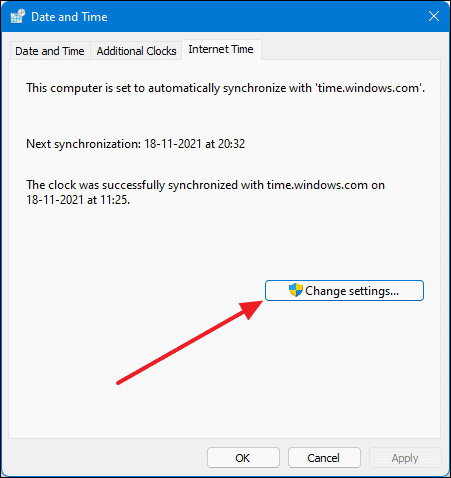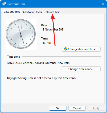 - In the Date and Time window, switch to the Internet Time tab.
