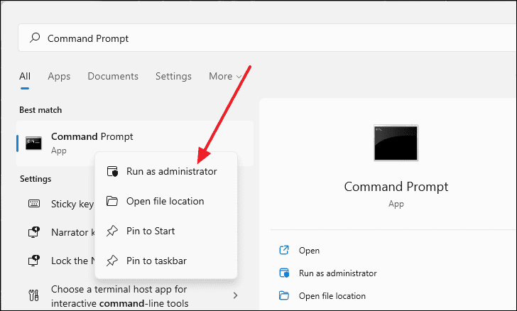 Windowskey and typeCommand Prompt. Right-click on it in the search results and select Run as administrator.