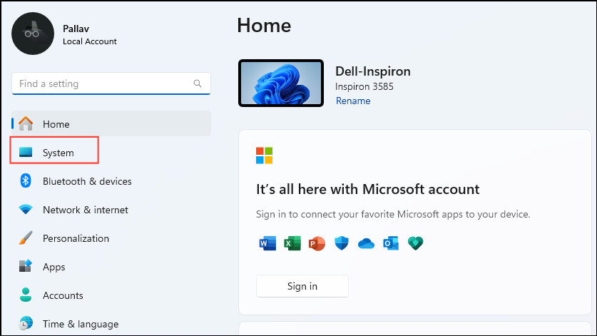 Win + Ishortcut and click on 'System' on the left.
