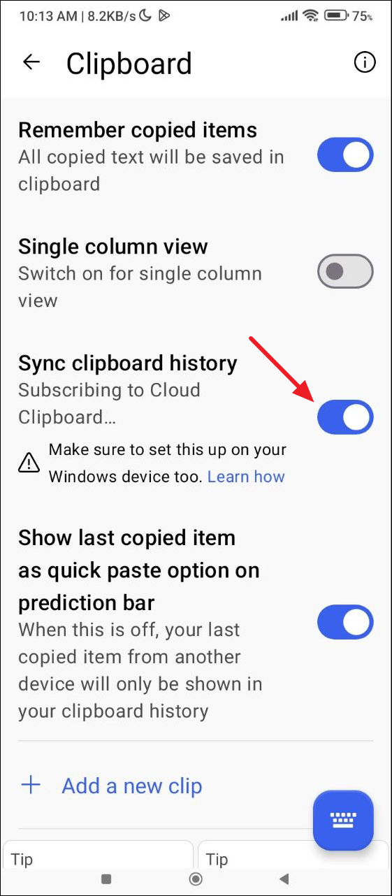 - Now, tap on the 'Sync clipboard history' toggle to turn it on.