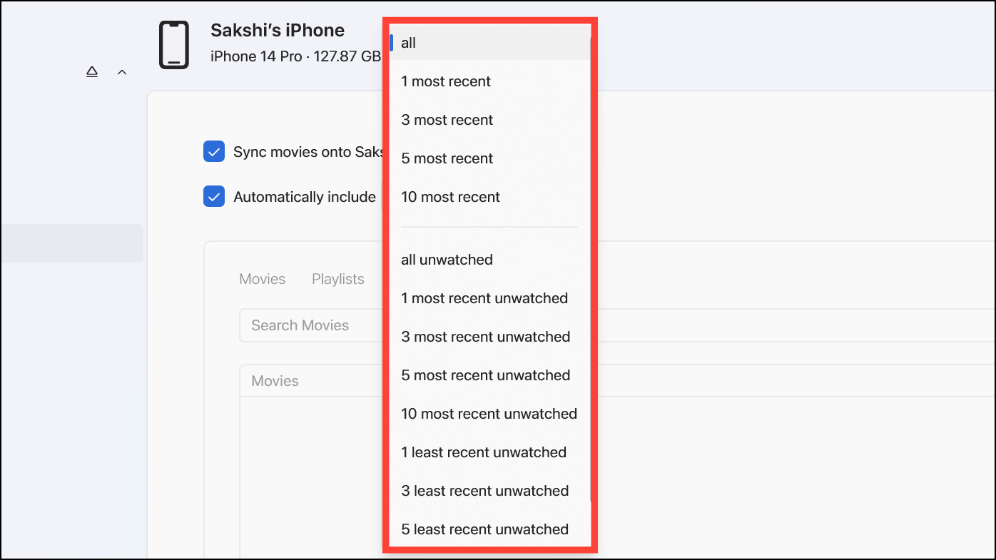 - Then, from the drop-down menu that says 'all', select the number of recent or unwatched movies you want to sync.