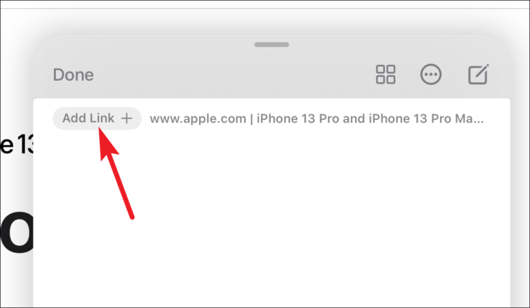 Tap ‘Add Link’ when you want to add the link for the current page from Safari or an app to the note.