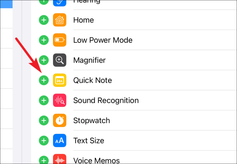 Make sure you have the toggle for ‘Access Within Apps’ open or you won’t be able to use this method to create a quick note within an app. Then, scroll down to ‘More Controls’ and tap the ‘+’ icon to the left of ‘Quick Note’.