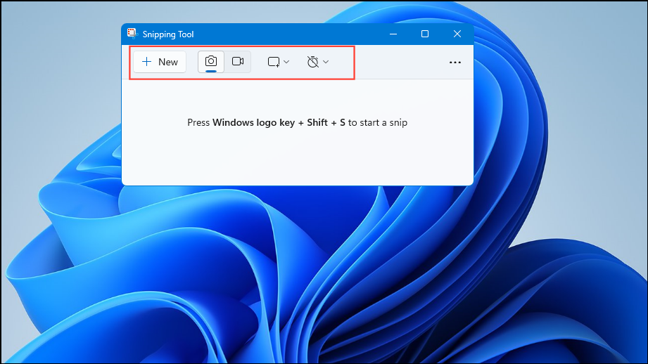 - The Snipping Tool will appear on your screen. Clicking on the 'New' button will allow you to take a new screenshot while the camcorder icon will let you record your screen. You can also change the snipping mode or take a delayed screenshot using the tool.