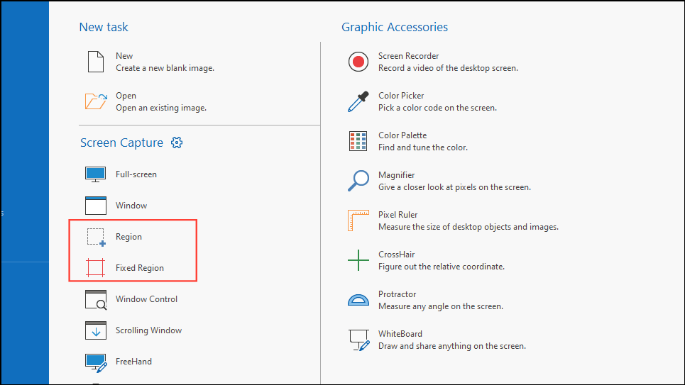 - You can also capture a specific area of your screen or a fixed region by clicking on the respective options.