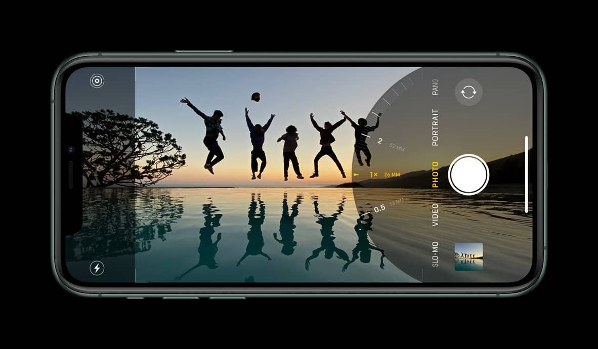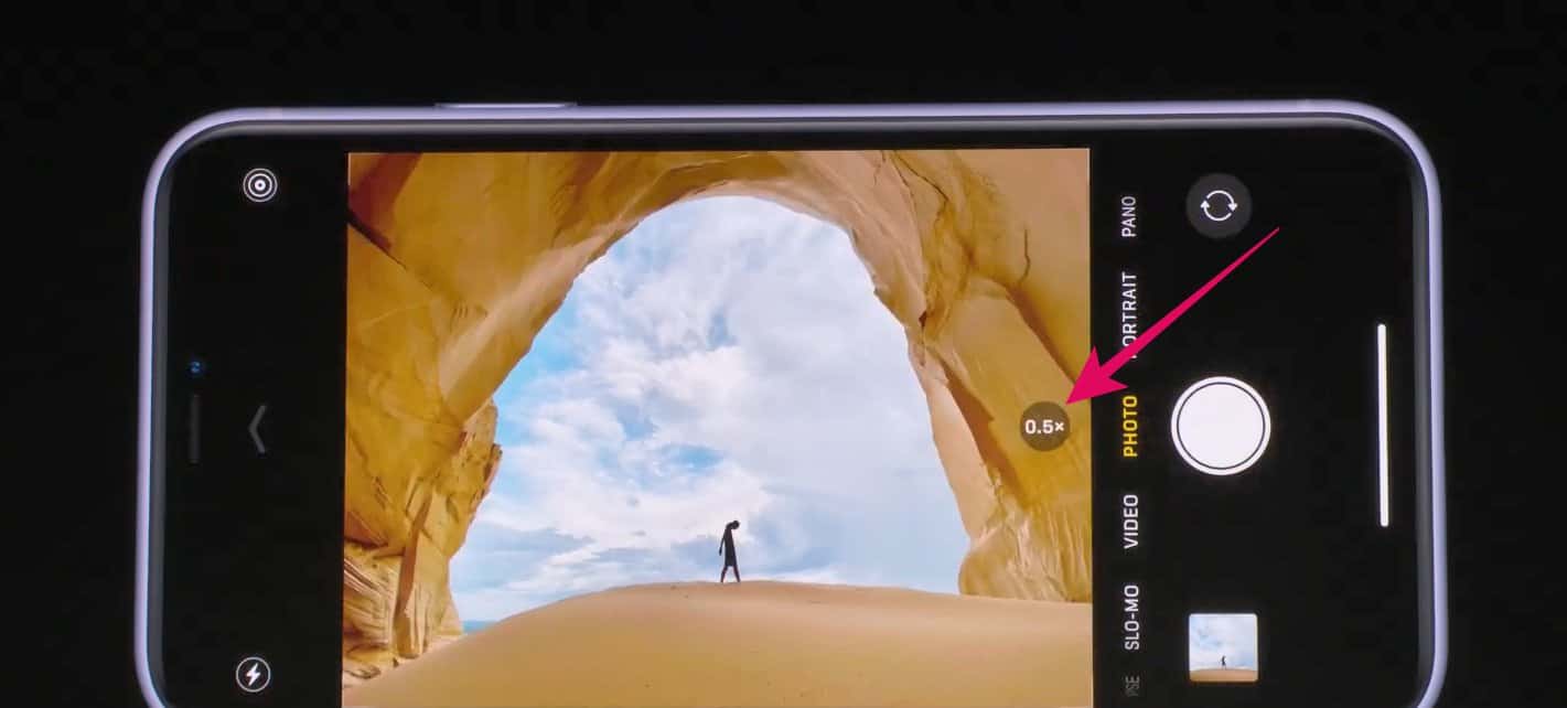 To take a wide photo on iPhone 11, open the Camera app, make sure it’s on Photo mode and then tap the 1x icon at the bottom of the viewfinder. It’ll switch to the 0.5x view which is the ultra wide angle on the new iPhones.