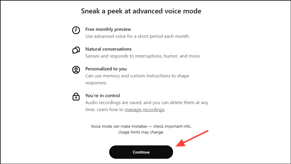 So, here's a tip, especially if you're a free user: don't fire up Santa mode until you've already used up your Advanced Voice Mode limit, which is only 15 minutes per month for free users. - Interactions with ChatGPT when using the Santa voice will not support memories and custom instructions which ChatGPT otherwise does in voice modes. This is probably because chats with Santa are temporary. So, the model will not remember things or perform custom actions you ask it to.