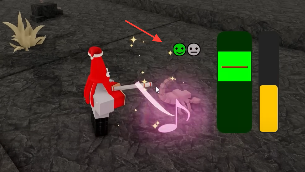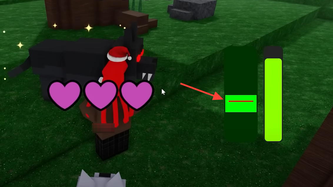 Equip a Taming Flute and start taming on a target animal. A vertical bar appears with a light-green target zone and a red marker. Hold to push the marker up; release to let it fall. Keep it inside the target zone to fill a yellow progress bar. Hitting 100% completes that attempt and pacifies the animal long enough to feed it.
